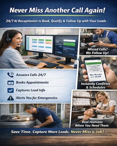 We help local service businesses turn missed calls into booked jobs using smart AI that answers, qualifies, books appointments, and follows up automatically. 24/7